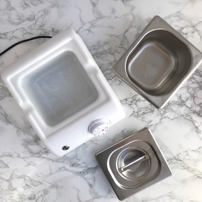 Изучив теорию, переходим к практике. Включаем мармит для шоколада в сеть. Помещаем темный шоколад в стальную ванную, закрываем крышкой и включаем мармит с помощью кнопки на задней его части.